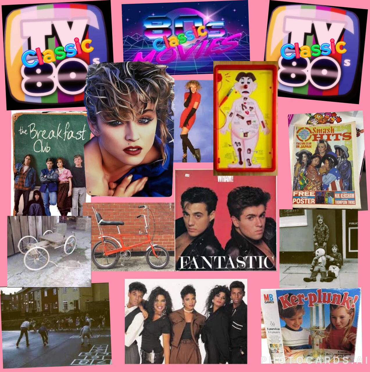 Here’s a Quick list WhyWham (George Michael)The Golden GirlsFive StarKylieMadonnaLive AidChopper BikeKer-Plunk. Buckaroo and OperationSaturday kids TV (Tiswas)Going out first thing in the morning coming back when Street lights came on(Brilliant)Smash Hits(Magazine)Loads More